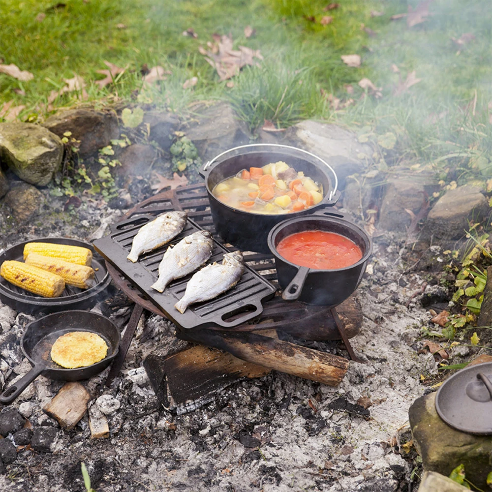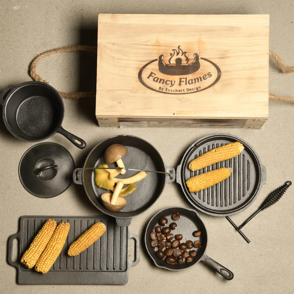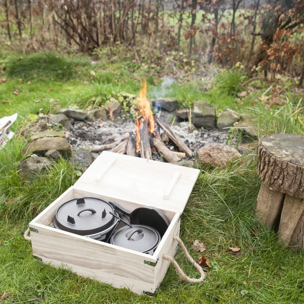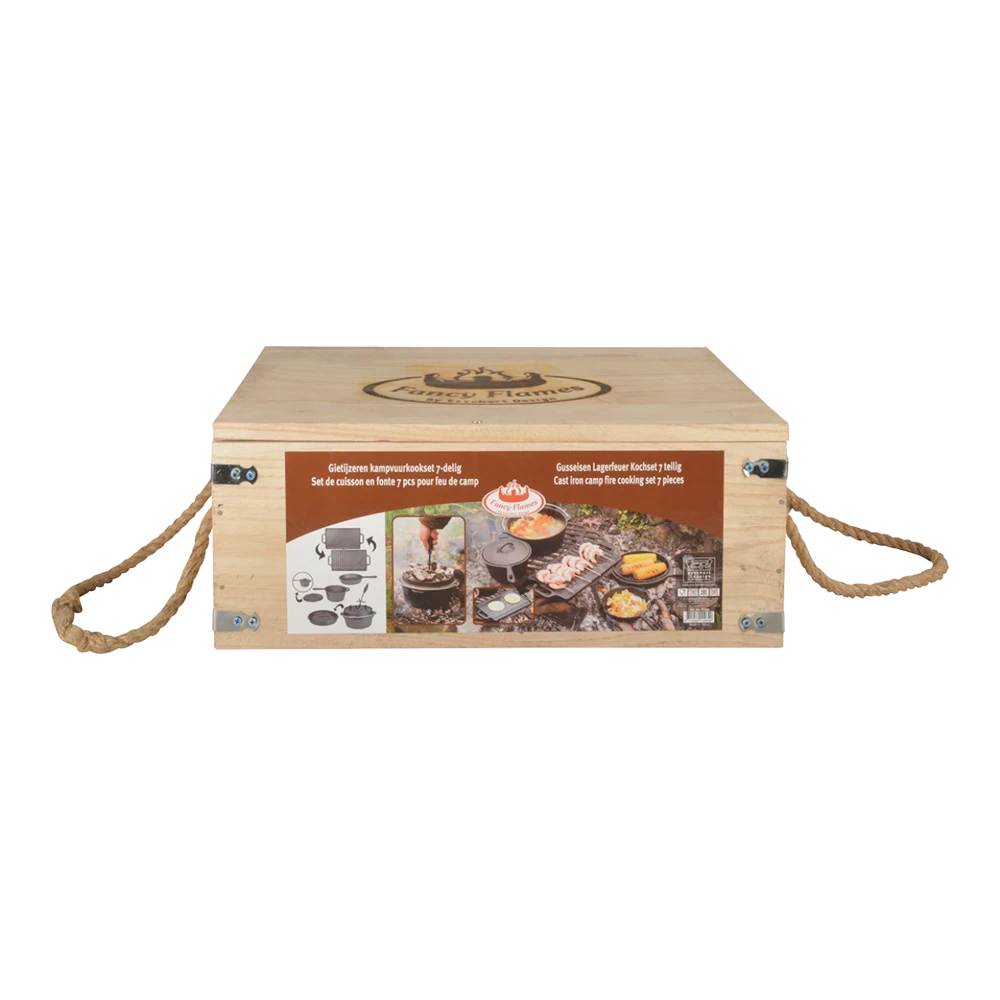 Buiten koken boven het vuur is een belevenis, een avontuur. Maak de heerlijkste gerechten klaar met deze complete 7-delige set, bestaande uit kampvuurpot, koekenpan met schenktuit, omkeerbare grillplaat met handgrepen, saus steelpan met deksel en dekselhaak. Al deze onderdelen zijn verpakt in een houten krat die is voorzien van handgrepen van touw, zodat het meenemen van de set makkelijk is. Tegelijkertijd biedt het krat ruimte voor extra kookgerei.