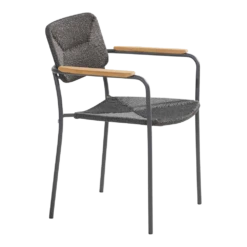 Het onderstel van de stoel heeft een houtlook, maar is vervaardigd uit aluminium. Hierdoor staat het niet alleen mooi, maar is de stoel ook onderhoudsvriendelijk! Het zitgedeelte is gemaakt van kunststof en bevat gaatjes voor de afvoer van (regen)water. Kunststof is sterk, onderhoudsarm en licht in gewicht. Beide materialen zijn zeer geschikt voor buiten.